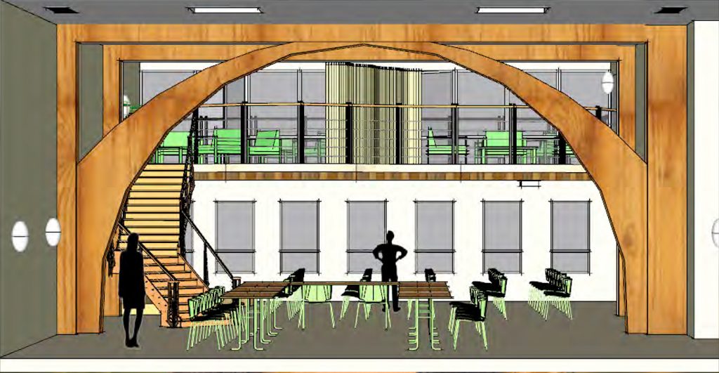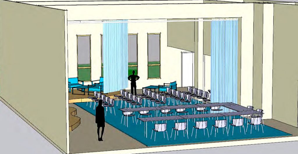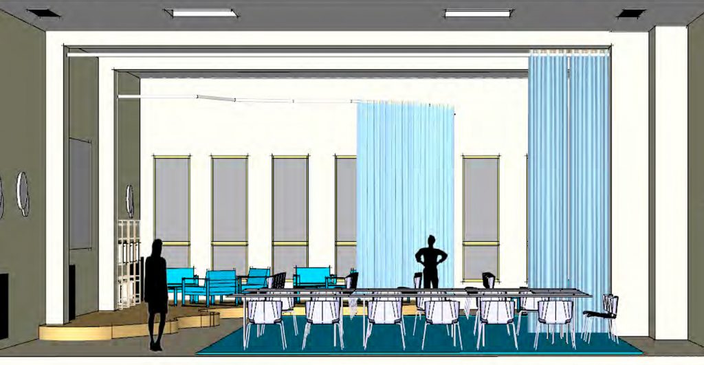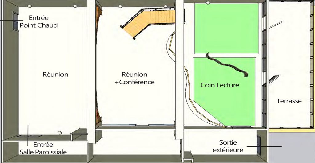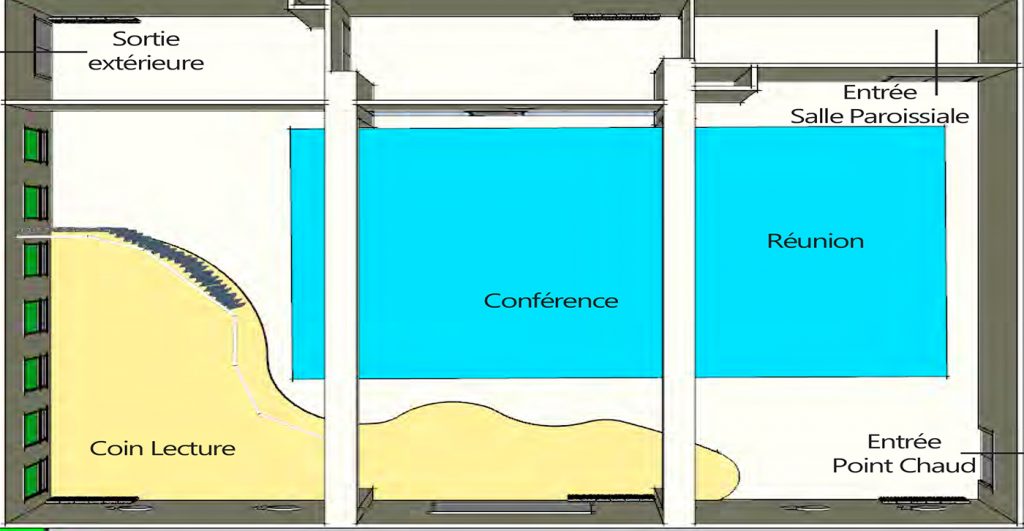 Munis d’un plan surdimensionné d’une époque bien lointaine sur lequel les cotes ne reflètent pas tout à fait la réalité, nous réfléchissons à ré-aménager la salle paroisiale dédiée aux réunions, conférences, kermesse et autres événements. Un coin « chaud » y est attenant et bien grisâtre aujourd’hui. 200 m2, une hauteur de plus de 5 m sous plafond nous invitent à imaginer quelque chose de plus accueillant, festif et mieux organisé. Des idées sont proposées, du mobilier et des matériaux. La lumière naturelle doit être mieux utilisée et maîtrisée. La ventilation par le renouvellement d’air est aussi un sujet à prendre en considération.