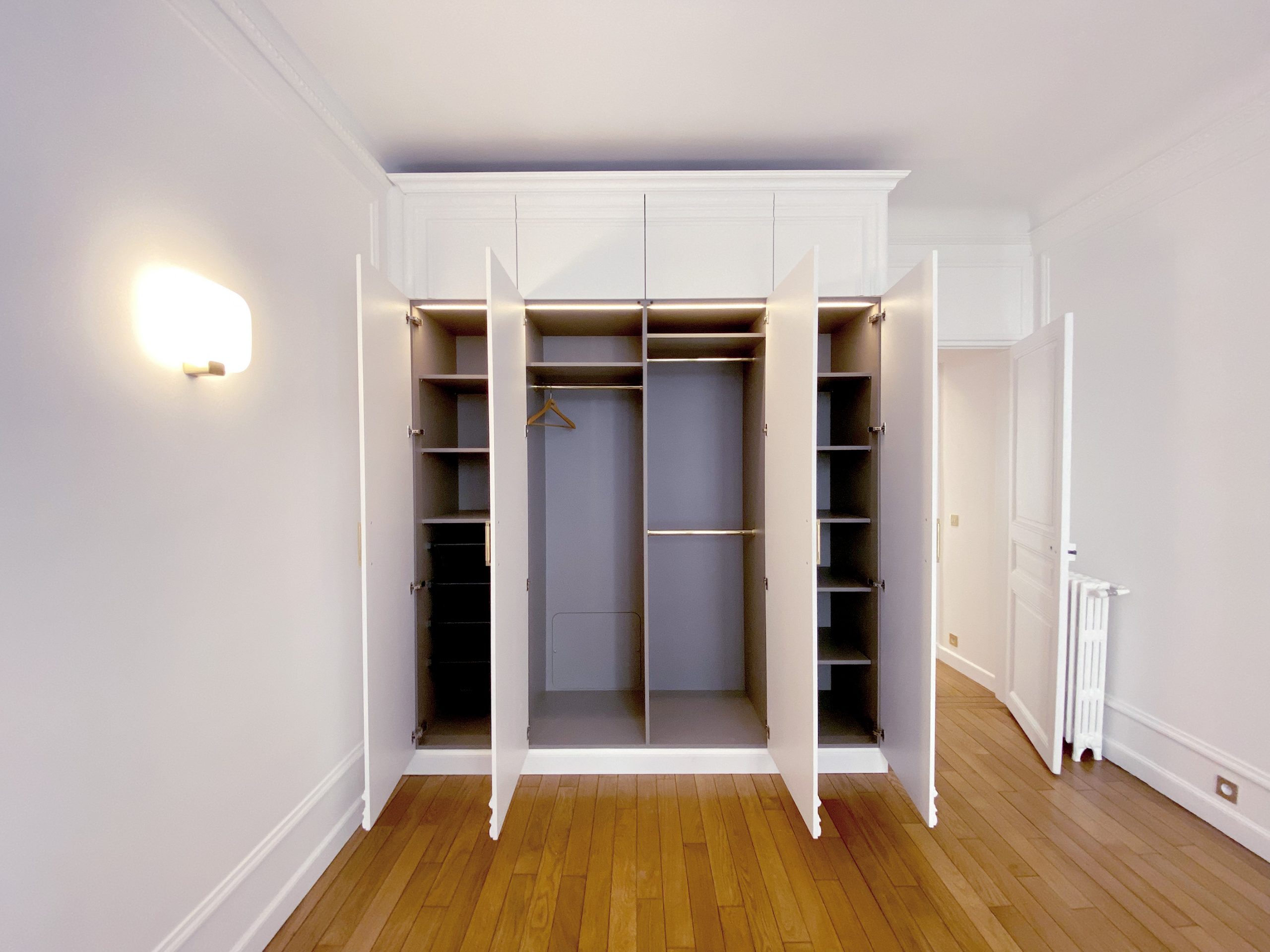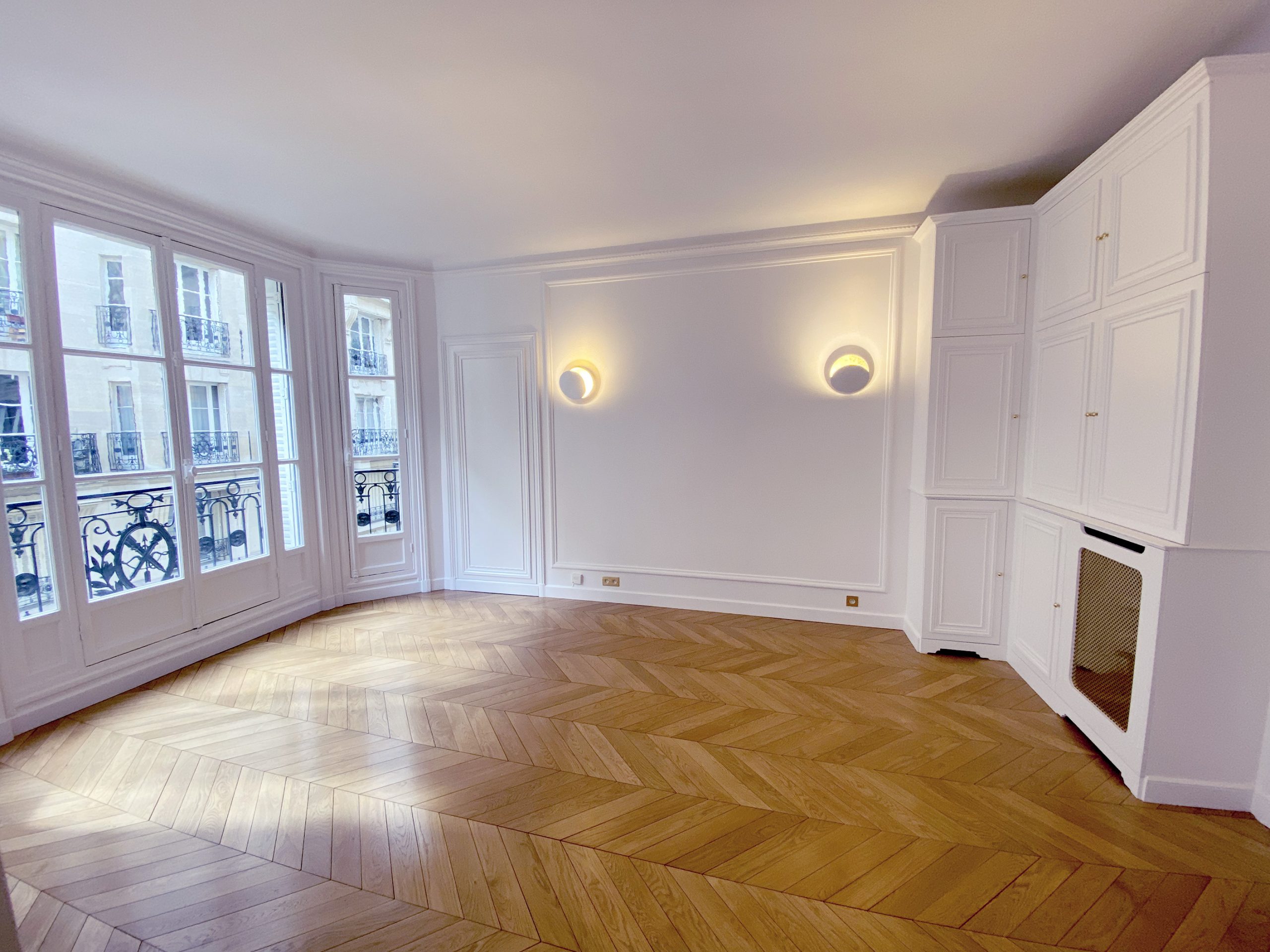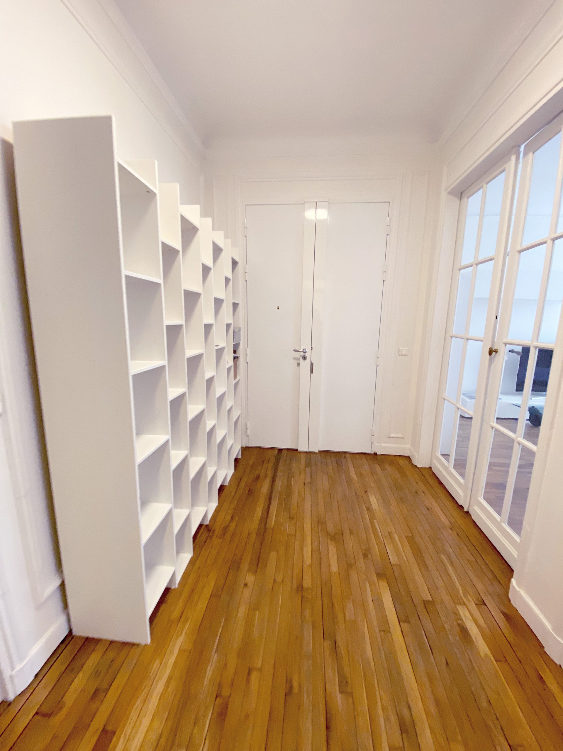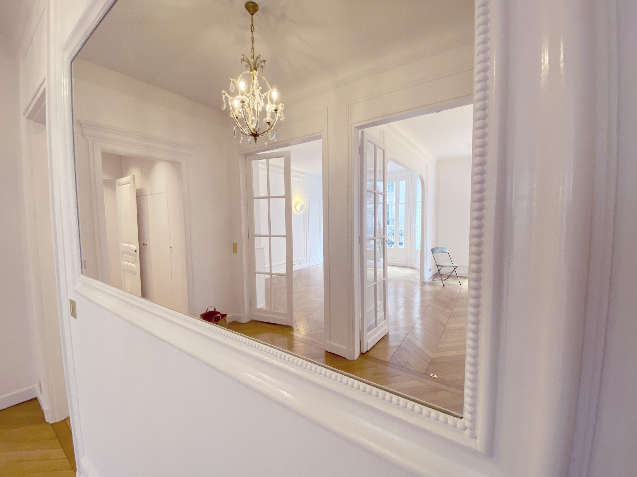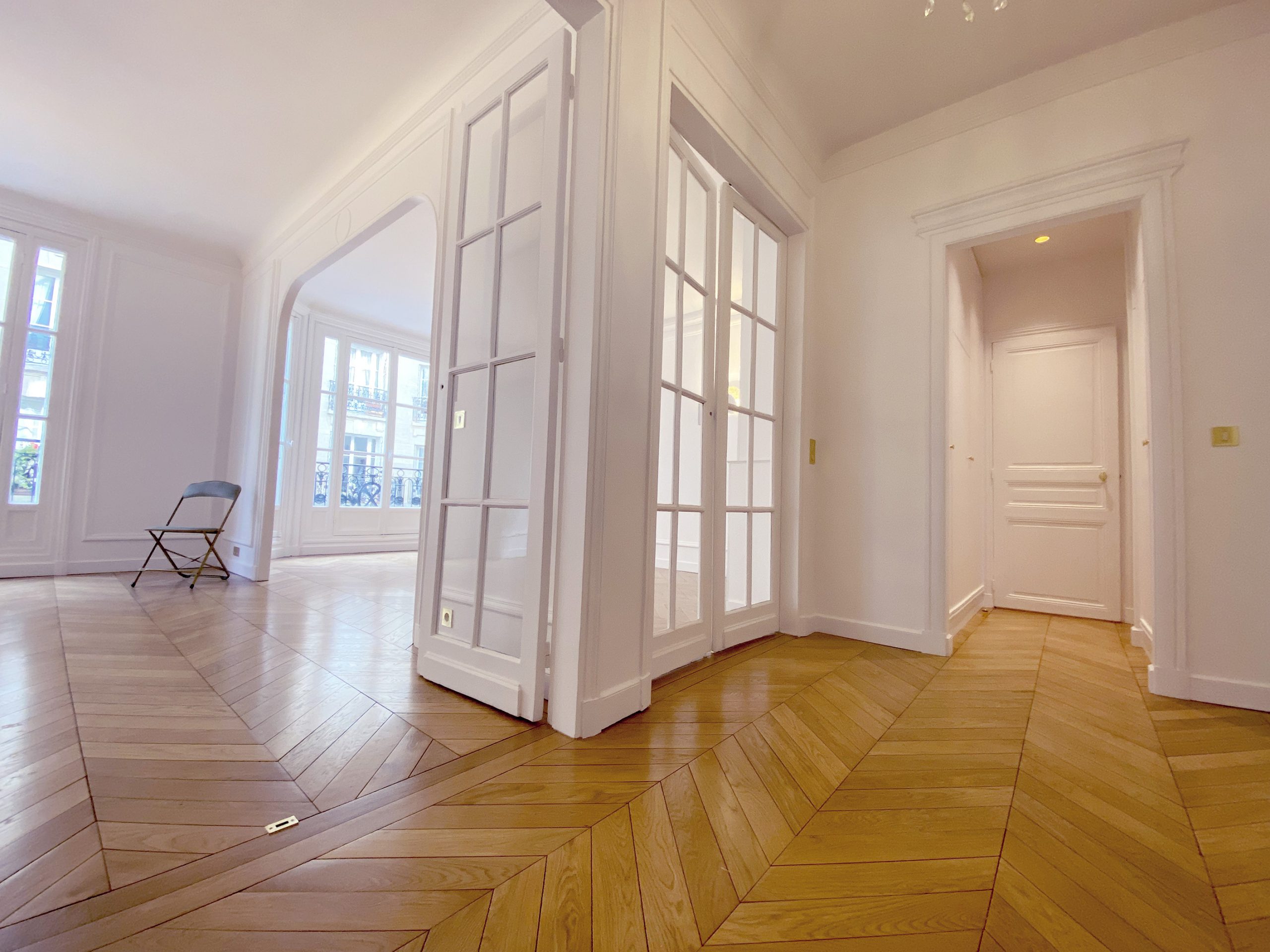 Pas si loin de la rue de Passy et de la maison de Balzac, c’est en blanc et or que l’appartement vous ouvre ses portes. Vous débutez par une enfilade de pièces de réception à commencer par l’entrée vraiment très confortable. On a travaillé avec un soin tout particulier à remplacer l’intégralité du parquet d’origine qui très curieusement était tout simplement laid. Fait de courtes et étroites lattes, celles-ci avec le temps s’étaient ternies. Franchement le lieu méritait mieux. Avec ses corniches, sa belle hauteur sous plafond, ses moulures d’origine, ses larges fenêtres, on a tout réhabilité avec un parquet en Point de Hongrie en chêne massif comme cela se faisait si traditionnellement au 19e s dans les appartements cossus du centre parisien. Le luxe ensuite vient des placards tous aménagés sur mesure selon les contraintes demandées, de la cuisine en effet marbré, des finitions or un peu partout.