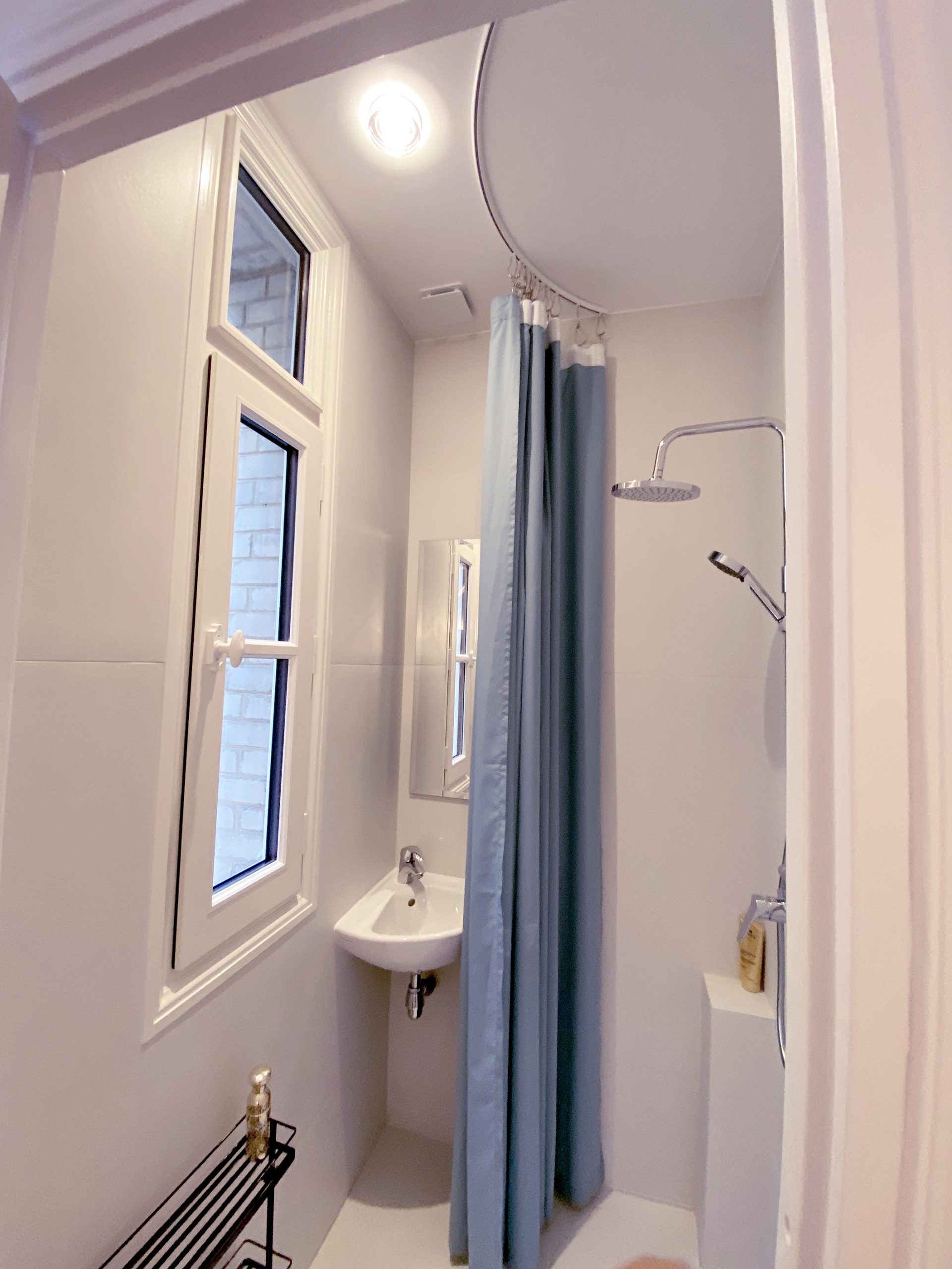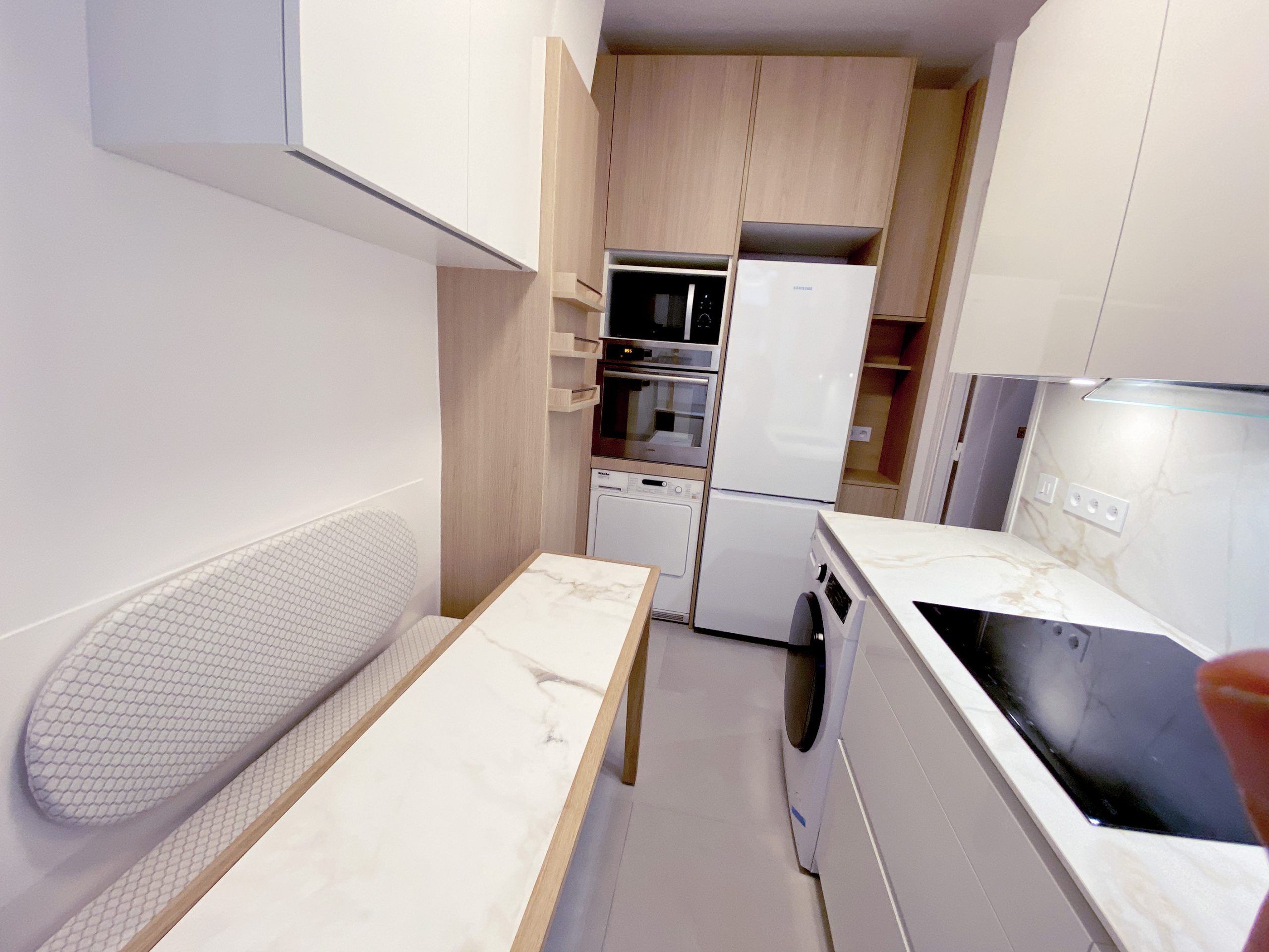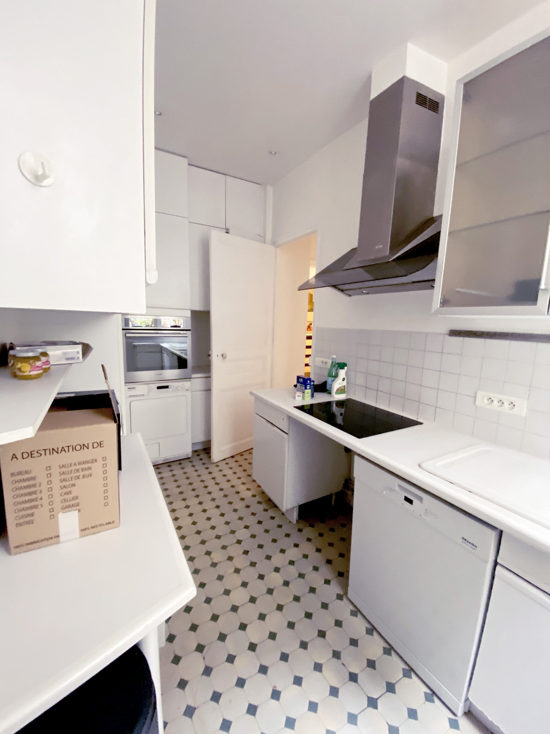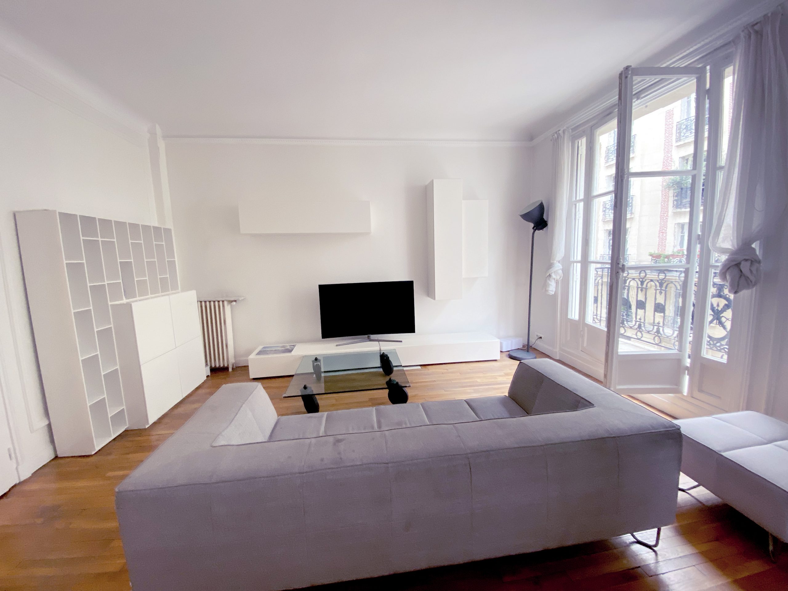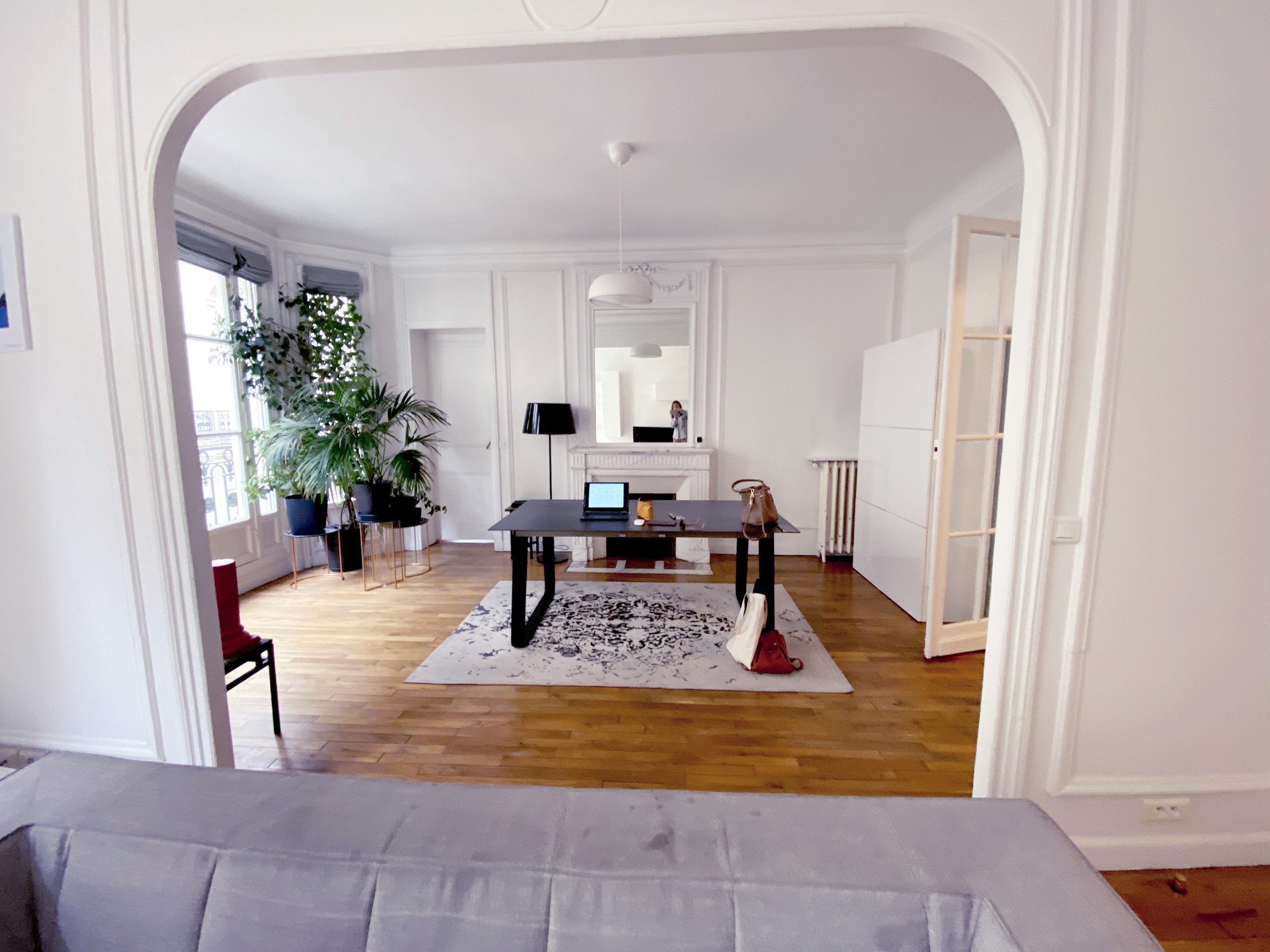 Pas si loin de la rue de Passy et de la maison de Balzac, c’est en blanc et or que l’appartement vous ouvre ses portes. Vous débutez par une enfilade de pièces de réception à commencer par l’entrée vraiment très confortable. On a travaillé avec un soin tout particulier à remplacer l’intégralité du parquet d’origine qui très curieusement était tout simplement laid. Fait de courtes et étroites lattes, celles-ci avec le temps s’étaient ternies. Franchement le lieu méritait mieux. Avec ses corniches, sa belle hauteur sous plafond, ses moulures d’origine, ses larges fenêtres, on a tout réhabilité avec un parquet en Point de Hongrie en chêne massif comme cela se faisait si traditionnellement au 19e s dans les appartements cossus du centre parisien. Le luxe ensuite vient des placards tous aménagés sur mesure selon les contraintes demandées, de la cuisine en effet marbré, des finitions or un peu partout.
